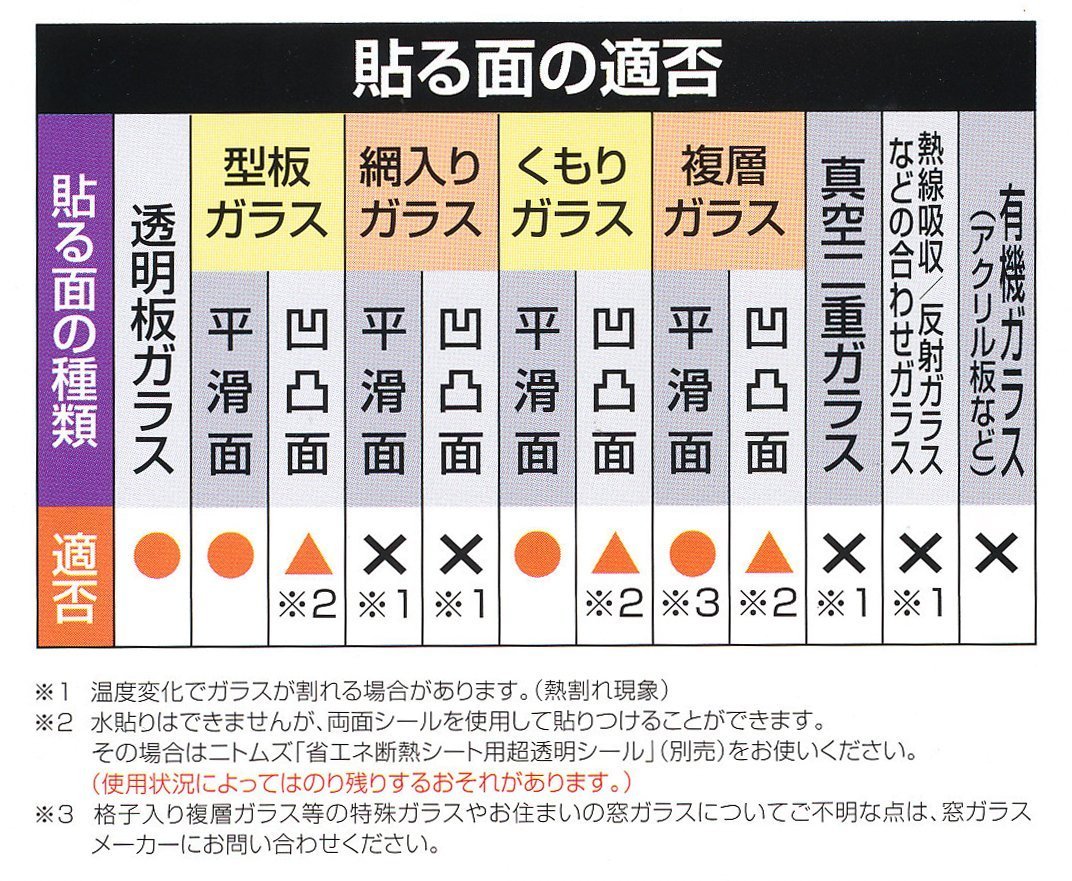貼ることができる面=透明板ガラス、型板ガラスの平滑面、くもりガラスの平滑面、複層ガラスの平滑面