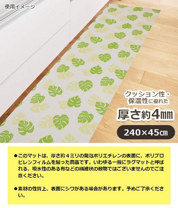 厚さ4mmの保温性に優れた発泡ポリエチレンが、床からの冷気をブロックし、足元のあたたかさを保ちます。表面にフィルムを貼っているので、水の飛び散りや油汚れがついてもサッと拭き取れます。長時間のキッチン作業にうれしい、クッション性のある素材を使用。裏面にはスベリにくいフィルムを貼っており、マットのズレを防ぎます。 |