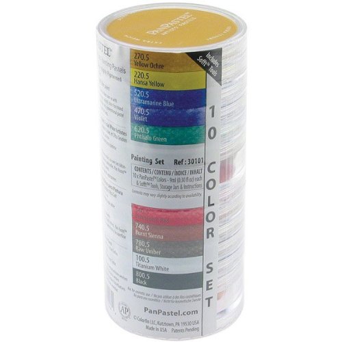 This PanPastel painting set colors are genuine artists quality pastels uniquely packed in a pan format. They were developed so that artists can easily lift, apply and control pastel color just like true painting. The pan format holds the color like paint for easy application. PanPastel is loaded with the highest quality artists pigments and have a rich, ultra-soft, low-dust formulation. All of the professional-quality colors have excellent light fastness, are fully erasable and compatible with traditional pastel sticks, surfaces, conventional fixatives and other artists' colors. This set includes storage jars, soft covers, soft mini applicators, soft sponge bars, instructions. Conforms to ASTM D4236. Painting set contents 10 colors of 9-msl PanPastel titanium white, hansa yellow, yellow ochre, permanent red, violet, ultramarine blue, phthalo green, burnt sienna, raw umber, black colors.Feature
