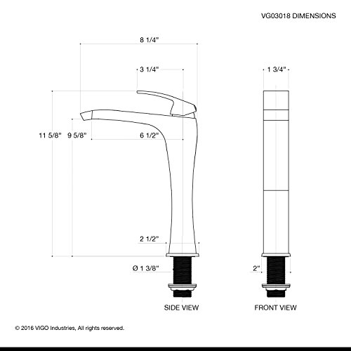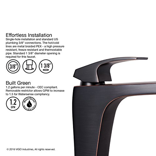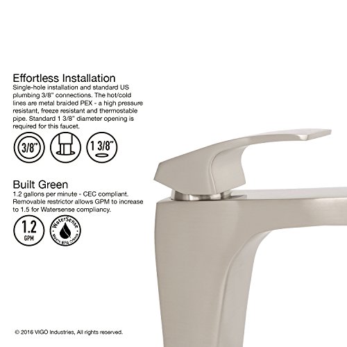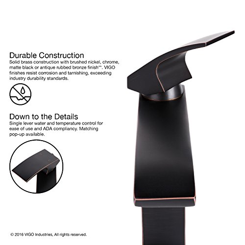 -. Binding : Tools & Home Improvement -. Brand : Vigo -. Color : Color -. Feature : Solid brass construction. / Available in Chrome, Antique Rubbed Bronze, Brushed Nickel, and Matte Black finish. / Easy Installation. / Finish resists corrosion and tarnishing. . / Water pressure tested for industry standard. -. Label : VIGO -. Manufacturer : VIGO -. PackageQuantity : 1 -. ProductGroup : Home Improvement -. ProductTypeName : PLUMBING_FIXTURE -. Publisher : VIGO -. Studio : VIGO -. Title : VIGO Blackstonian Single Lever Vessel Bathroom Faucet with Pop Up