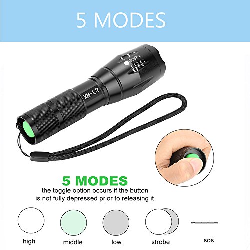 - ULTRA-BRIGHT LIGHT: The brightest flashlight adopt high-efficiency and great Output Cree XML-L2 LED Chip. It can output brightest light ,you can use it in a darkness night or fantastic caves. The ON/OFF push button switch is the end of cap.