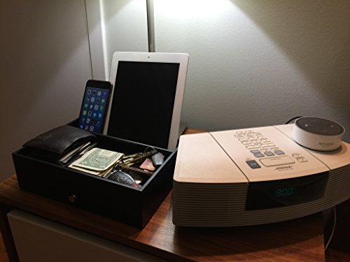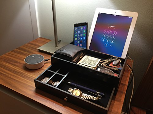 Mens Charging Valet Key Tray – Night Stand Dresser & Jewerly Box Organizer for Men as a Black Wood Modern Looking Holder Cell Phone Charging Station Night Stand Keys Watch Organizer - Gift Idea