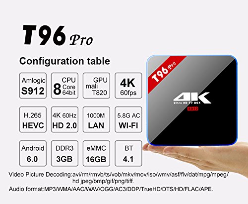 -. Title : T96 Pro Android TV Box Amlogic S912 Octa-Core 3GB/16GB Android 6.0 KODI 16.0 WiFi 2.4G/5.8G LAN 1000M Bluetooth 4.1 Streaming Media Player
