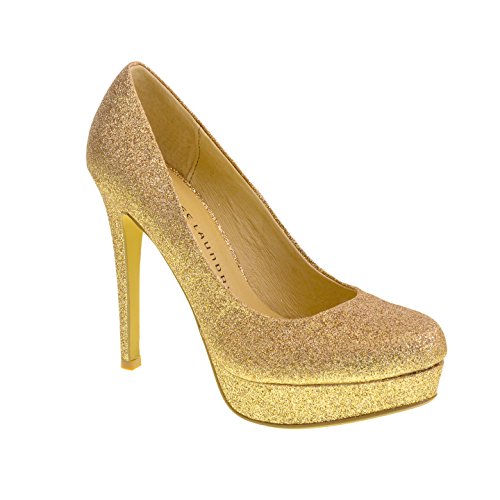 Stand tall in the Wow glitter platform pump featuring a 5" stiletto heel and 1" platform. This is a wardrobe must-have. It pairs perfectly with everything from denim to dresses. By Chinese Laundry. Manmade patent 5" heel 1" platform Color - GOLD