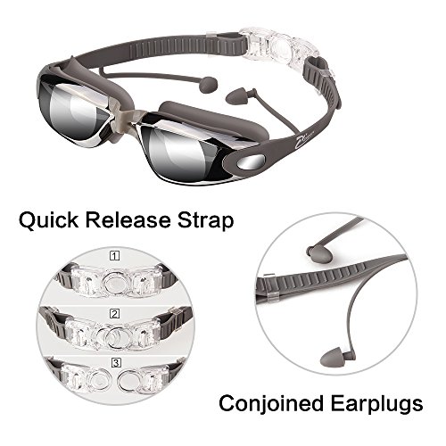 ► ENJOY YOUR SWIMMING--The Mirrored anti-fog goggles used poly-carbonate has incredible impact resistance. The design of swim cap allows you to cut through the water with far less drag, reduce your energy expenditure, and maximize your overall efficiency. The nose clip and earplugs not only protect your nasal cavities and eardrum, but also imporve your swimming performance.