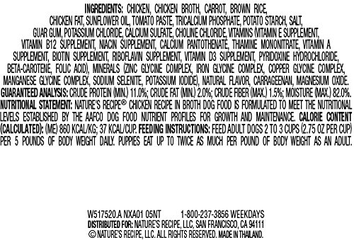 Nature's Recipe Chicken Recipe In Broth is delicious wet dog food with real chicken as the #1 ingredient. High-quality protein from that premium source helps maintain lean muscles. Carrots and brown rice supply carbohydrates that help provide sustained energy-and all the goodness is served in a savory broth. For over 30 years, Nature's Recipe has purposefully crafted recipes with all natural ingredients, and added vitamins, minerals, and nutrients.Feature