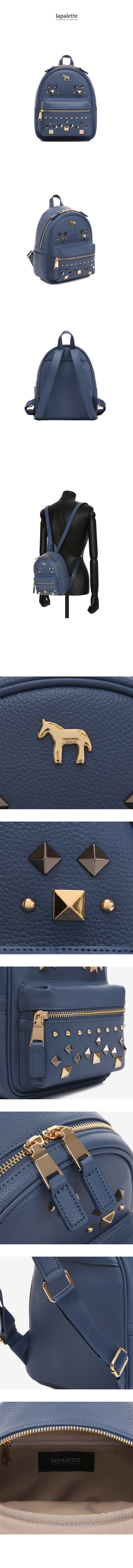 | 디테일 | 로봇을 형상화한 스터드 배열과 라빠레뜨 금속로고 장식으로 포인트를 준 "ROBOT STUD LINE." 골드 럭키홀스 장식을 사용하여 보다 여성스러운 이미지 강조 다양한 형태의 스터드 조합, 그립감 좋은 지퍼플러 등 세심한 디테일로 고급스러움 양방향 지퍼 슬라이더와 길이조절 가능한 스트랩, 핸들 디테일 등으로 사용 편의성 높임 편안한 캐주얼룩 뿐만 아니라 귀엽고 여성스러운 룩에 포인트를 줄 미니 사이즈 백팩 |