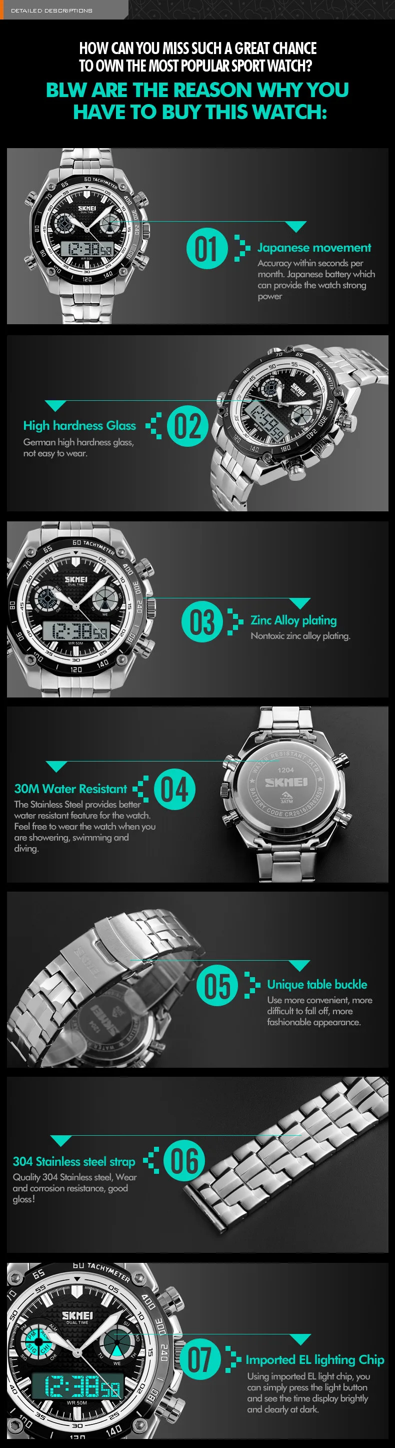 Feature:Alarm,Back Light,Water Resistant,Shock Resistant,Complete Calendar,Multiple Time Zone,Chronograph,Auto Date,LED display