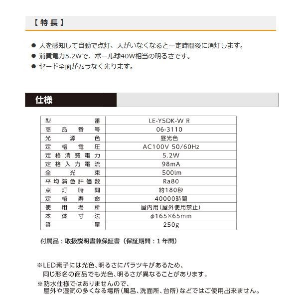 人感センサーで人を感知すると自動で点灯、人がいなくなると一定時間後に消灯するLEDミニシーリングライトです。 製造国:中国 ※サプライヤー直送品 ご注文後2~3営業日後の出荷となります【商品名】オーム電機 OHM センサー付LEDミニシーリングライト 昼光色 LE-Y5DK-W R