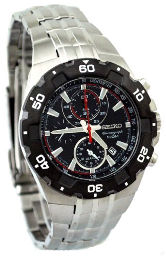 Stainless steel case with a stainless steel bracelet. Unidirectional black TiCN plated bezel. Black dial with luminous hands and index hour markers. Minute markers. Tachymeter around the inner bezel. Luminiscent hands and markers. Date display between the 4 and 5 o'clock positions. Chronograph - three sub-dials displaying: 60 seconds, 60 minutes asnd 12 hours (alarm). Quartz movement. Scratch resistant hardlex crystal. Screw down crown. Solid case back. Case diameter: 44 mm. Case thickness: 11 mm. Deployment clasp with push button release. Water resistant at 100 meters / 330 feet. Seiko Premier Chronograph Stainless Steel Mens Watch SNAD35.Feature