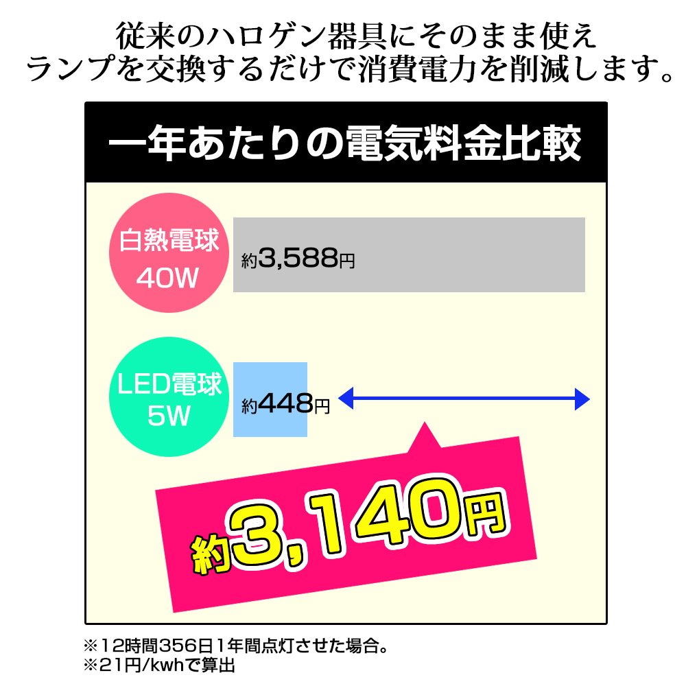 Energy saving: equivalent to halogen lamp 40 W type, rated power 5 W only, 87% electricity cost can be omitted compared to general incandescent light bulbs.