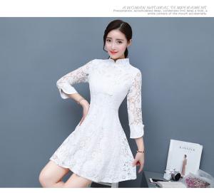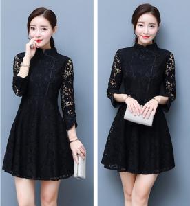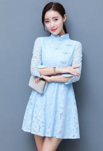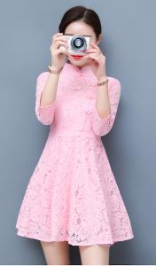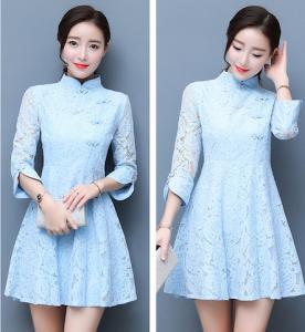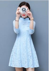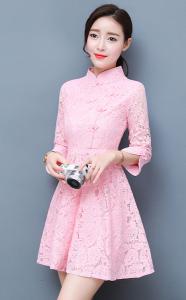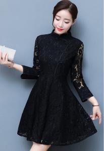 レースワンピース 刺繍 フレアスカート 7分袖 ハイネック チャイナドレス ハイウエスト ドレス プチプラ