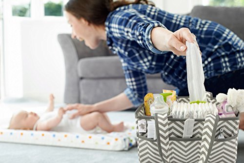 - ADJUSTABLE VELCRO DIVIDER | The easy-to-use adjustable Velcro dividers makes customizing your diaper caddy easy. Use both dividers to allow 3 spacious sections. Using 1 divider works great for a pumping station or don’t use a divider and maximize the area for blankets or toys.