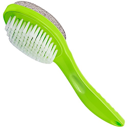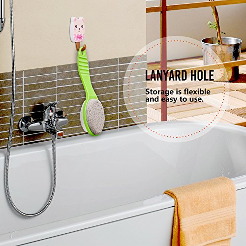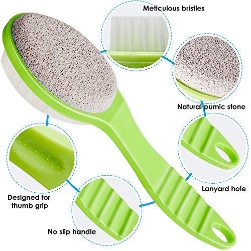 - ERGONOMIC DESIGN: Double-sided design, one side is natural pumice stone, remove your exfoliating, callus, dead rough skin; another side is meticulous bristles that can better clean your feet. Non-slip handle for comfort grip, there is a lanyard hole in the tail of handle, you can hang it up for drying and storage.