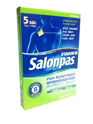 -. Feature : Salonpas pain relief patch (7 cm x 10 cm) (5 patches/pack) / for pain relief: shoulder, neck, joint, back., last up to 8 hours. / Usage: clean the skin is dry, peeling off the adhesive sheet. / free!! sticker Thai_product, souvenir from Thai_product.,High Quality & Services by Thai_product.