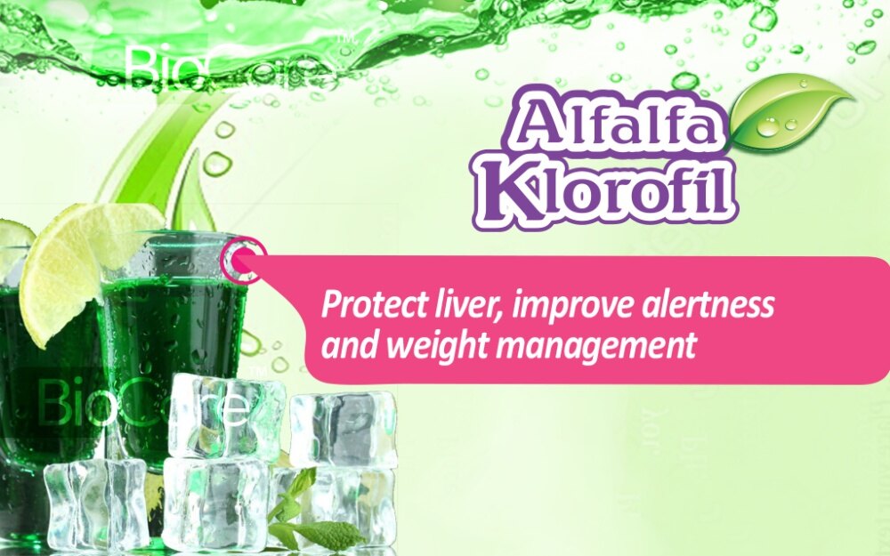 Alfalfa contains 4 times the chlorophyll level that of normal vegetable. A tablespoon of chlorophyll powder is equivalent to the nutrient in 1 kilogram of vegetables. It is a natural and rich with nutrients that can improve health, get rid of wrinkles and excellent anti-aging.