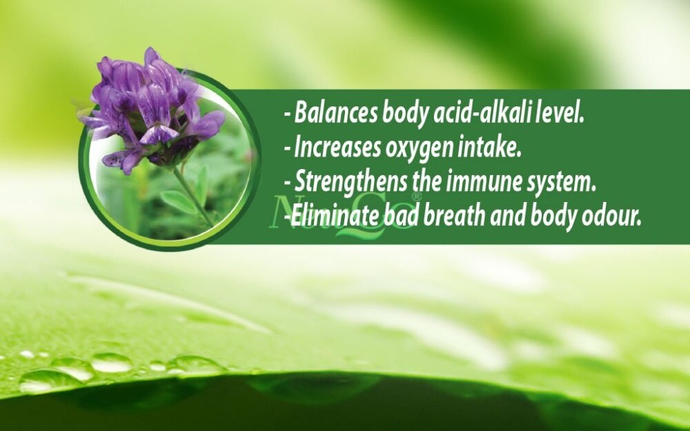 除此之外, 此产品也结合了含有多种维生素(A, B-1, B-6, C, E 和K)以及矿物质(钙,钾,铁和锌)的紫花苜蓿精华。紫花苜蓿同时也是丰富蛋白质, 纤维以及叶绿素的来源,对於人体内胆固醇值的平衡也相当有帮助!