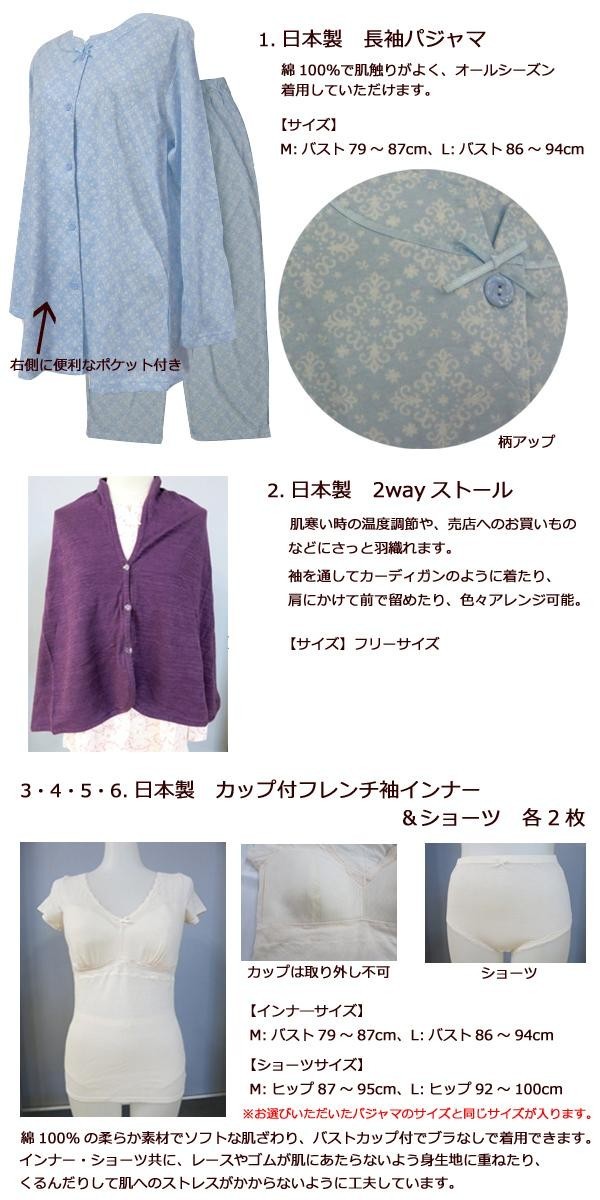 | 素材・材質 | 【パジャマ】綿100% 【2wayストール】綿100% 【カップ付きフレンチ袖インナー】身生地:綿100%、レース:ナイロン・ポリウレタン・その他 【ショーツ】身生地:綿100%、レース:ナイロン・ポリウレタン・その他 【タオル】綿100% 【ルームシューズ】ベース:ポリエステル100%、中材:EVA+PE 【ソックス】ポリエステル・綿・その他 |