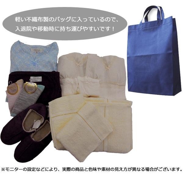 女性の入院に必要なアイテムを12点セットにして、専用のバッグに入れてお届けします。入退院や移動時の持ち運びにも便利です。ご自身やご家族のために準備しておくと安心です♪ |