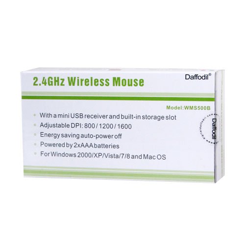 -. Binding : Electronics -. Brand : Daffodil -. Feature : Nano Receiver - Small enough to be left pled in during transport / 2.4GHz Radio Frequency Connection - Reliable operation from up to 10m / 1600dpi Optical Sensor - Works on any non transparent surface / Adjustable DPI - On the go adjustment of cursor sensitivity for precise control / Ergonomic 3 Button Design - Comfortable use for right and left handed operators -. Label : Daffodil -. Manufacturer : Daffodil -. PackageQuantity : 1 -. Platform : Mac OS X / Windows XP / Windows 7 / Windows Vista / Windows -. ProductGroup : CE -. ProductTypeName : CONSUMER_ELECTRONICS -. Publisher : Daffodil -. Studio : Daffodil -. Title : Daffodil WMS500 Wireless Optical Mouse 2.4GHz - Cordless 3 Button PC Mouse with Scrollwheel and Adjustable Sensitivity (MAX DPI: 1600) - For Laptop / Netbook / Desktop Computers - Supported by: Microsoft Windows (7 / XP / Vista) and Apple MAC (OS X +) - Battery Powered (2xAAA Inc.)
