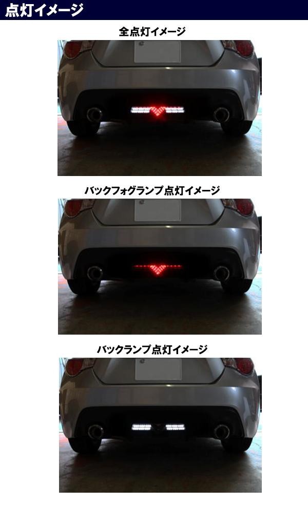 | 仕様 | ■車検適合 ■保証期間:1年 ■適合車種:TOYOTA 86(DBA-ZN6)、SUBARU BRZ(DBA-ZC6) ■適合年式:2012年(平成24年)4月から現行まで ■LED色:(バック時)ホワイト、(バックフォグ時)レッド |
