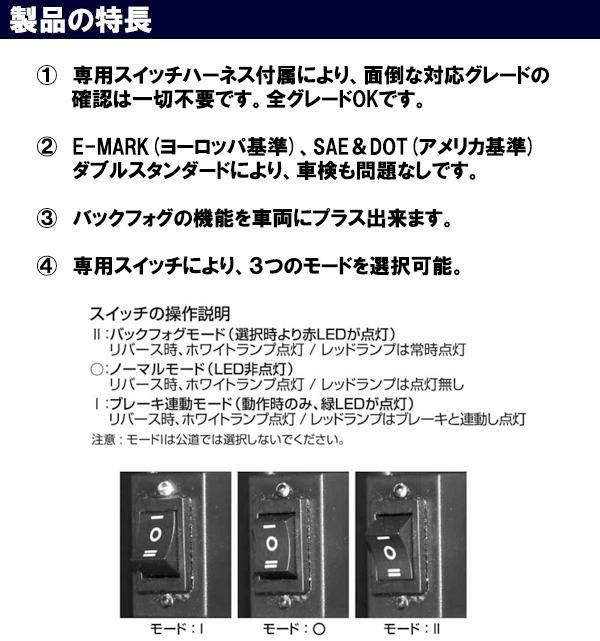 | 悪天候時に後方からの被視認性を高めるバックフォグ&バックランプ。専用スイッチハーネス付属により、面倒な対応グレードの確認は一切不要!!全グレードOKです。また、E-MARK(ヨーロッパ基準)・SAE&DOT(アメリカ基準)をクリア。ダブルスタンダードにより車検も問題ありません。 |