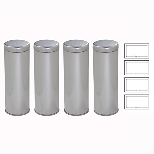 Silver Metal Tea Tin Canister with Metal Interior Seal Lids, for Coffee and Tea Container, For Dried Herbs and Spices, Loose Leaf Tea 8 oz - holds 4 - 6 oz loose leaf tea each (4 pack) + Labels