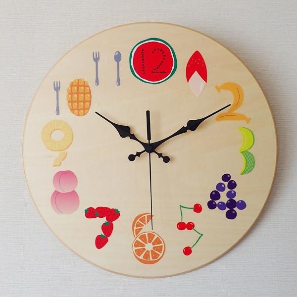 | 丸い形と温かみのある素材、そしてカラフルなフルーツの文字盤が可愛いくて個性的な壁掛け時計です。専用のBOXに入れてお届け致しますので、自分用はもちろんプレゼントにもピッタリです♪ |