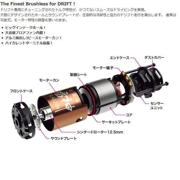 ドリフト専用にチューニングされたトルク特性が、かつてないスムーズなドライビングを実現。大胆にデザインされたホールとサウンドプレートが、圧倒的な冷却性と迫力のドリフト走行を演出します。進角は可変式で、モーター特性の調整も思いのままです。 |