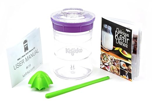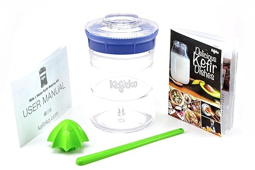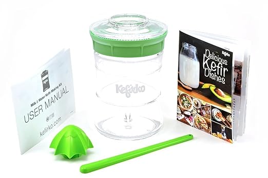 [Product Information]- KEFIRKO - THE WORLD'S EASIEST HOME KEFIR MAKING SYSTEM - Includes unique 20 oz concave glass jar, strainer lid, secure cover lid, citrus juicer attachment, swizzle stick, user guide and recipe booklet.