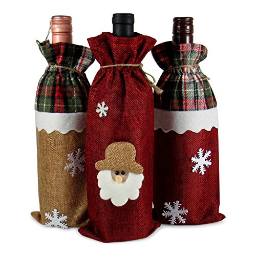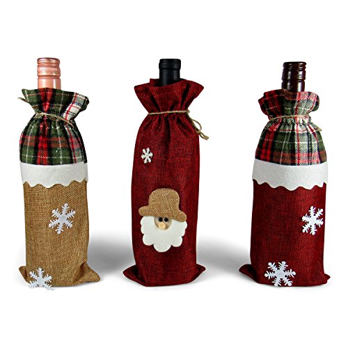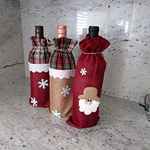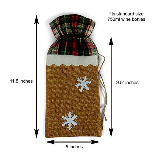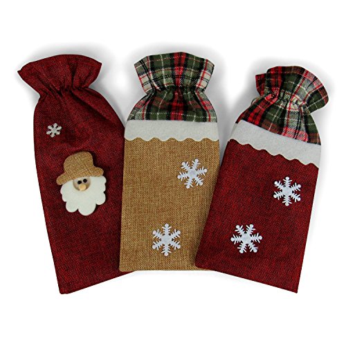 Product Description These attractive bags come in a set of three (one Santa and two snowflakes). They feature a nice quality jute cloth paper bag with felt trimmings. Makes wrapping wine bottles quick and easy. Perfect for all your Christmas gift giving needs. 0