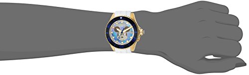 Invicta 22754 Disney Limited Edition women's automatic dive watch features a 38mm wide and 15mm thick yellow gold plated solid stainless steel case with a unidirectional rotating black accented gold tone bezel and textured screw down crown. Invicta 22754 is powered by a reliable Japanese TMI NH35A automatic movement with 24 jewels. This beautiful watch also features a Mickey mouse printed blue mother of pearl dial with white accents gold tone luminous hands and dot hour markers along with the date display function, scratch resistant mineral crystal and water resistant to 300 meters. Invicta 22754 is equipped with an 18mm wide white and blue backing silicone strap with a buckle clasp. Invicta 22754 women's Disney Limited Edition MOP dial white & blue strap automatic dive watch is brand new and comes in an original Invicta gift box and is backed by a 5 year limited warranty.Feature