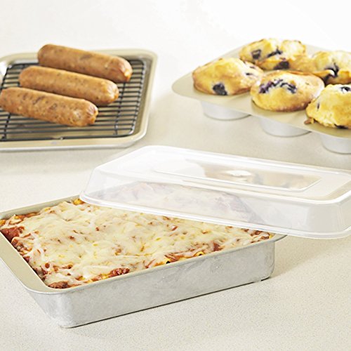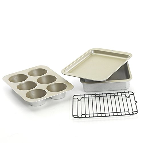 The Nordic Ware 43215 Compact Ovenware Aluminized Steel 5-piece Bakeware Set is perfect for small baking jobs. Use it with your toaster oven for extra convenience. Whether you''re traveling in a camper or baking with kids, you''ll delight in the just-right size of these cute baking pans. This 5-piece bakeware set is a perfect gift for college students. The broiler pan with grill will cook dinner for two with less cleanup than regular-size pans. The aluminized steel construction means that even the smallest dishes will bake perfectly as it absorbs and distributes heat evenly. It isn''t easy to find pans in this handy size, let alone a charming set of five. The Nordic Ware name is associated with the quality, dependability, and value recognized by millions of homemakers. The company''s extensive finishing technology and history of quality, innovation, and consistency in this highly technical and specialized area make it a true leader in the industrial coatings industry. Since founding Nordic Ware in 1946, the company has prided itself on providing long-lasting quality products that will be handed down through generations. Its business is firmly rooted in the trust, dedication, and talent of its employees, a commitment to using quality materials and construction, a desire to provide excellence in service to customers, and never-ending research of consumer needs. Heavy gauge, rust-proof aluminized steel. Small size bakes in conventional or toaster ovens. Safe for use in oven, refrigerator, and freezer. Sturdy plastic lid fits all pans in set. 10.25 L x 7.25 W x 3.5 H inches.