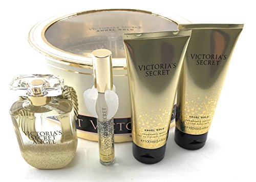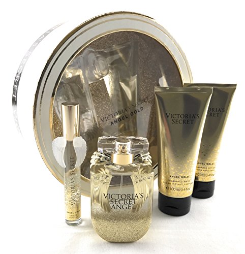 -. Feature : Victoria's Secret Angel Gold Gift Set Box / 4 pieces included in a round gift box / Eau De Parfum: 1.7 FL OZ / Travel Size Rollerball Eau De Parfum: .23 FL OZ / Fragrance Wash/Gel: 3.4 FL OZ / Fragrance Lotion 3.4 FL OZ