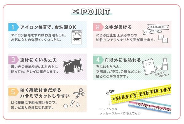 | 仕様 | 水洗い可(アイロン接着後) にじみ防止加工済 |