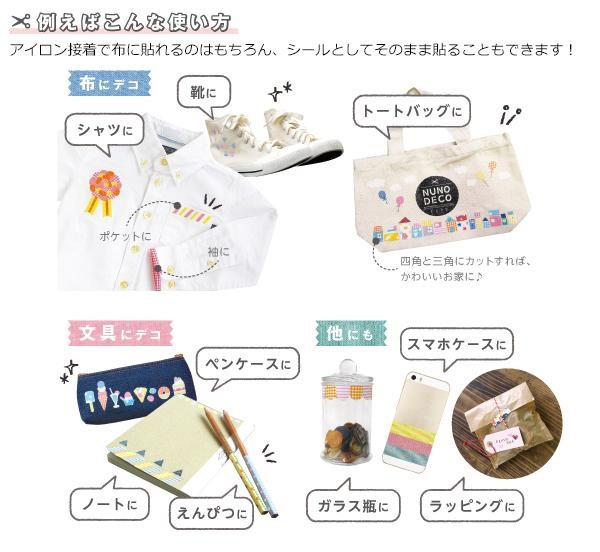 | 布に貼れる、布のテープです。布の質感と金箔のきらきらでちょっとリッチなデコが楽しめます。アイロン接着後は、水洗いもOK!!ビンやノートなどの素材には、そのまま貼って楽しむことも出来ます。 |