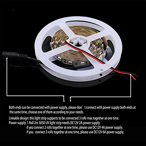 Powerful 5050 SMD UV blacklights LED light strip; Length: 2 meters/6.6ft; LED quantity: 120leds in total; powered by DC 12V 2A power supply(not included), Please search " DZ024HL 120200U/B01L7JEAN0" on Amazon if you need one.