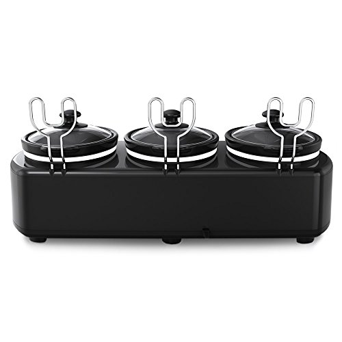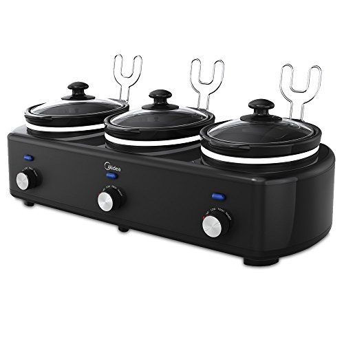 Midea's M3SC1715 Triple Slow Cooker enables the home chef to create their own buffet, whether preparing a trio of dips, soups or sides. The M3SC1715 is equipped with three 1.5 Quart, oval ceramic removable cooking vessels that can be controlled independently and in three cook settings – Low, Medium, High and automatic Keep Warm. It has heat-proof handles for a cool touch, lids holders for each crock helps make serving and cleanup a breeze, dishwasher-safe glass lids and stoneware potsFeature