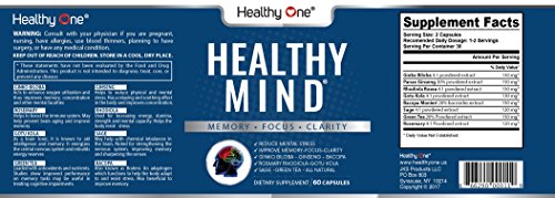 -. Title : Healthy Mind - Memory, Focus and Clarity Brain Nootropic Supplement 60 Capsules - Max Strength All Natural. Ginko Biloba, Ginseng, Bacopa, Rhodiola, Sage, Gotu Kola, Green Tea, Rosemary
