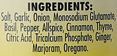 - Ingredients: Salt, Garlic, Onion, Mononsodium gluatmate (MSG), Basil, Pepper, Allspice, Cinnamon, Thyme, Citric acid, Tricalcium phosphate, Ginger, Marjoram, Oregano. Please note that this product contains MSG.