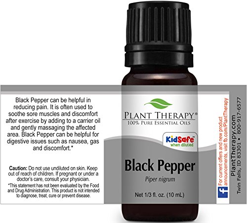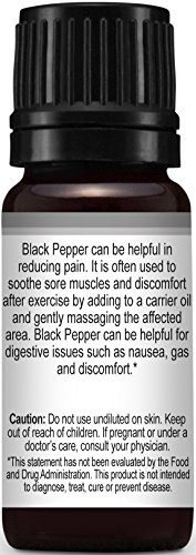 -. Feature : Botanical Name: Piper nigrum, Country of Origin: Sri Lanka, Extraction Method: Steam Distilled, Plant Part: Fruits, Strength of Aroma: Medium / Add Black Pepper to a carrier oil and and gently massage into the affected area. Black Pepper can also be helpful for occasional digestive issues such as queasiness, bloating, and discomfort. / Aromatic Scent: Black Pepper has a warm, fresh, dry-woody scent. / Have Questions? Message one of our Certified Aromatherapist through Amazon messages / Blends Well With: Bergamot, Copaiba Balsam, Cypress, Frankincense, Geranium, Juniper Berry, Rose absolute, Rosemary, Sandalwood and Vetiver.