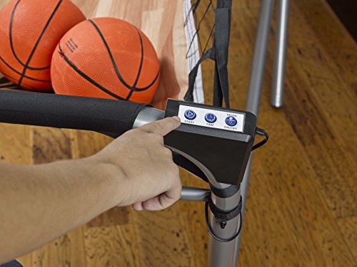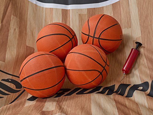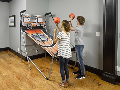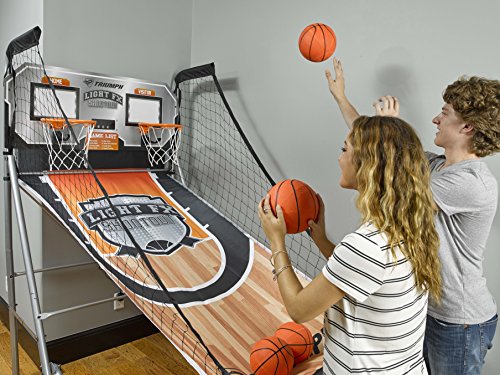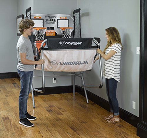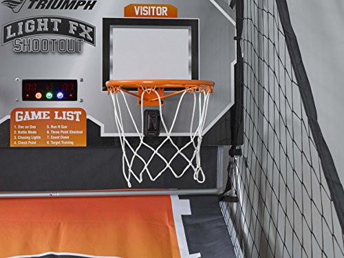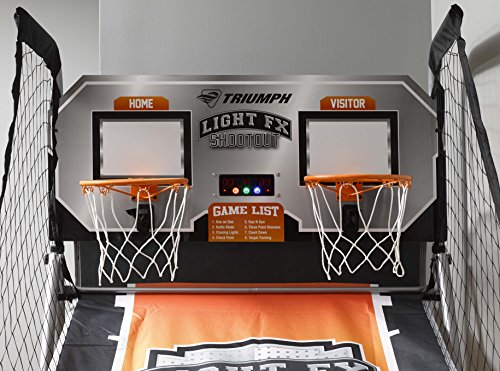 Shoot lights out with the new interactive LED technology of the Triumph light FX double shootout arcade Basketball game. This illuminated shootout features eight light-up game modes or casually shoot hoops on your own with family and friends. The shootout's quick connect frame is easily assembled in five minutes or less with preassembled parts so you can start playing faster. The large 1.5 inch diameter frame poles offer excellent support and stability for years of high-scoring hoops. This shootout includes four basketballs and an inflating pump with needle. When you're finished playing, the light FX shootout conveniently folds up into an ultra-compact storage position.Feature