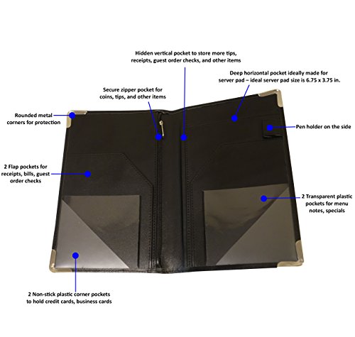 THE SERVER BOOK WITH THE MOST POCKETS + PEN HOLDER - You want to stand out from the rest! Made of quality PU leather this server book features 9 Pockets for receipt papers, menu notes/specials, etc. including 1 secure zipper pocket! We are the original creators of the pen holder on the side for fast easy access!