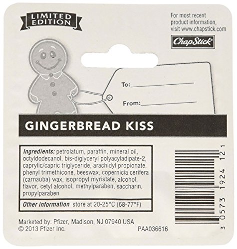 -. Feature : Chapstick limited edition seasonal Gingerbread Kiss flavor. / One 0.15 ounce tube on blister card. / Helps heal severely dry, chapped lips. / Temporary relief of pain associated with fever blisters and cold sores. / A great stocking stuffer!