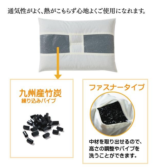 福岡県八女郡立花町産の竹炭を練り込んだパイプを使用しています。パイプ使用のため通気性がよく、熱がこもらず心地よくご使用できます。ファスナー式で中材(パイプ)の交換、高さ(量)の調節が可能です。ご家庭で簡単にパイプが洗えます。 |