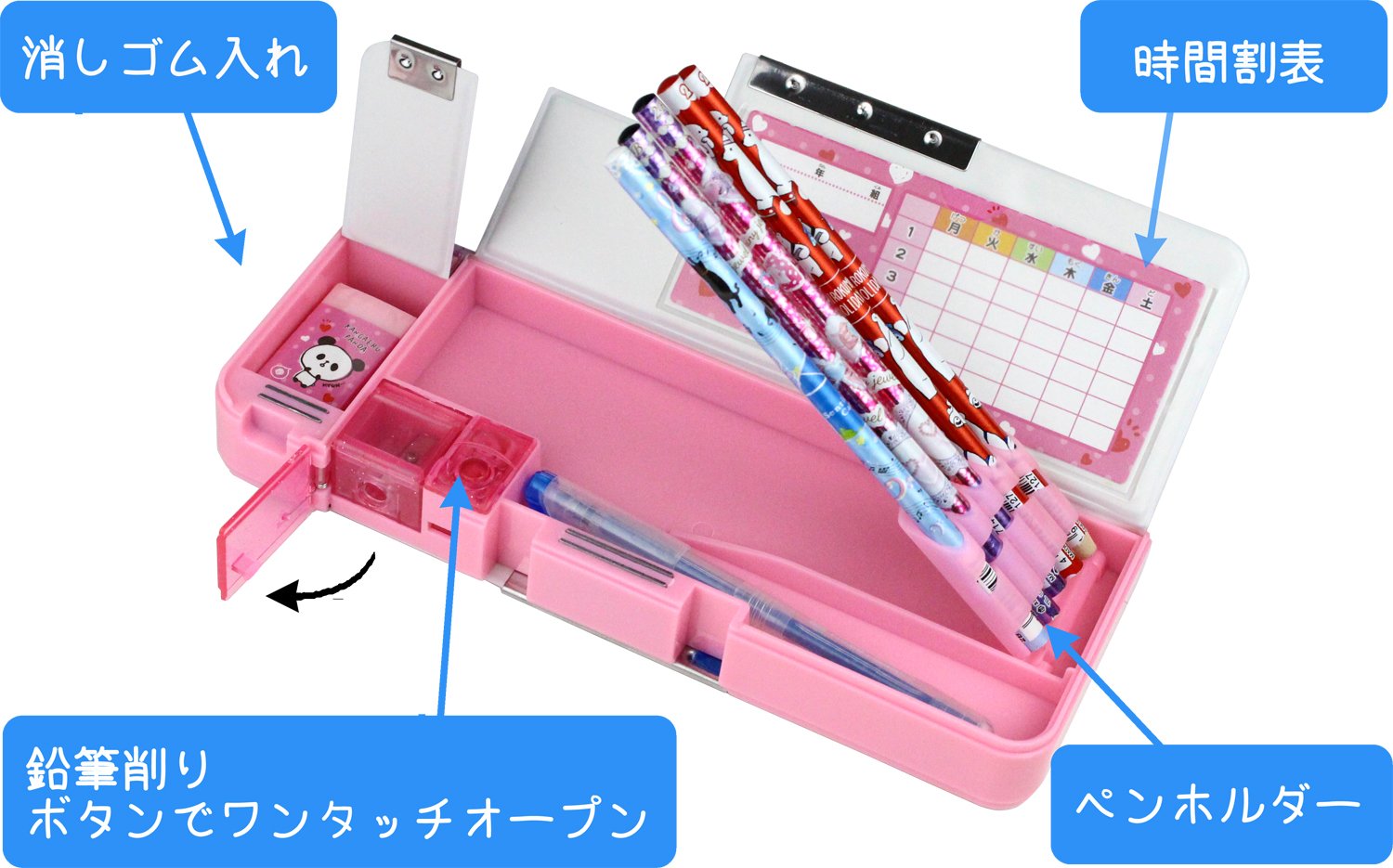 Easy to take out pencils and pens, adjustable angle pen holder, one-touch open pencil sharpener, convenient pen case with eraser insert.