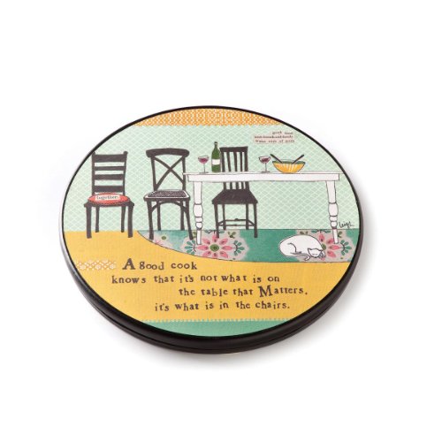 -. Feature : Demdaco Collection: Curly Girl Design by Leigh Standley / Sentiment: A good cook knows that it's not what is on the table that matters, it's what is in the chairs / Witty and whimsical Lazy Susan / Materials: wood composite, canvas, plastic Measures: 155" diameter / Makes a perfect hostess gift or witty home decor accent