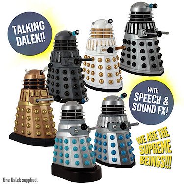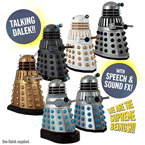 Studio : Underground Toys Publisher : Underground Toys Binding : Toy Product Description The Daleks were created by the Kaled scientist, Davros as travel machines. He had deduced that the years of radiation and chemical poisoning from an ongoing war would lead his race to mutate into immobile organisms. The Dalek travel machines would house these creatures and allow the Kaleds to survive. However, in the course of his experiments, Davros deliberately removed what he considered to be debilitating emotions from the mutants and a force of evil was spawned! The Daleks were born without any ability to feel compassion or pity and were motivated only by hate, fear and an implacable belief that they were the superior creatures in the Universe. Recreate scenes from Doctor Who with these highly detailed 5" poseable Dalek action figures. Featuring the following six Daleks, modelled accurately on some of the famous Daleks from past episodes. Bronze Dalek (2005), Dalek Invasion of Earth (1964), Power of the Daleks (1966), Revelation of the Daleks (1985), Planet of the Daleks (1973) and Death to the Daleks (1974). Each Dalek includes sound FX and speech by era! Collect them all! Six to Collect. One supplied. Requires 3 x 1.5V Batteries included. For ages 5 years and over. 0