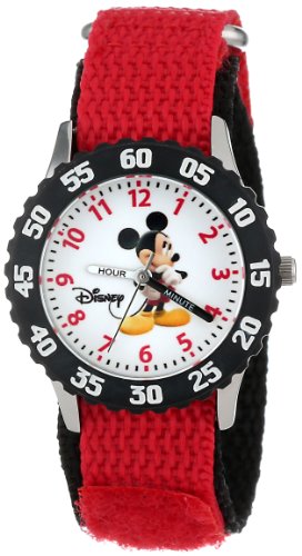 Round watch in stainless steel with numbered gear-shape bezel, Mickey Mouse graphic on dial, and labeled hour and minute hands