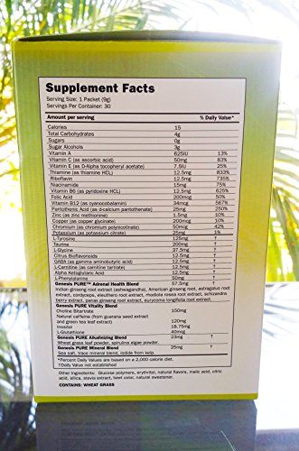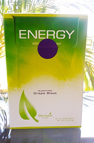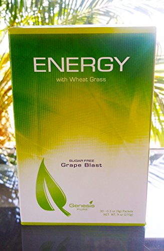 -. Binding : Health and Beauty -. Brand : Genesis PURE -. EAN : 0645871601941 -. Feature : Genesis Pure ENERGY is a powdered energy mix alternative with no sugar or artificial sweeteners. / Created for lasting energy and enhanced mental focus, this clarifying formula includes natural sources. / Caffeine and ProP.R.Ietary Blends of Amino Acids, Minerals, Herbs, and Botanicals. / Formulated with an antioxidant blend of vitamins A, C, and E, and a comprehensive B-complex, this delicious energy mix is truly unique. / Drink Genesis PURE ENERGY to help stimulate your body and mind. -. IsAdultProduct : 0 -. Label : Genesis Pure -. Manufacturer : Genesis Pure -. PackageQuantity : 1 -. ProductGroup : Health and Beauty -. ProductTypeName : HEALTH_PERSONAL_CARE -. Publisher : Genesis Pure -. Studio : Genesis Pure -. Title : Genesis Pure Energy with Wheat Grass Grape Blast Sugar-Free Powder Mix Dietary Supplement 30-0.3oz (9g) Packets Net Wt. 9 oz (270g) -. UPC : 645871601941